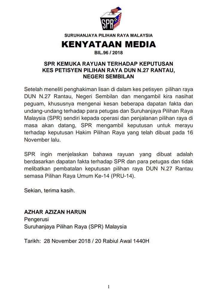 Suruhanjaya Pilihan Raya Malaysia On Twitter Suruhanjaya Pilihan Raya Malaysia Kenyataan Media Bil 96 2018 Spr Kemuka Rayuan Terhadap Keputusan Kes Petisyen Pilihan Raya Dun N 27 Rantau Negeri Sembilan Setelah Meneliti Penghakiman Lisan Di