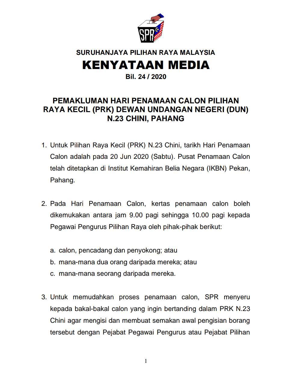 Suruhanjaya Pilihan Raya Malaysia On Twitter Kenyataan Media Pemakluman Hari Penamaan Calon Pilihan Raya Kecil Prk Dewan Undangan Negeri Dun N 23 Chini Pahang Https T Co Jmre9uravc